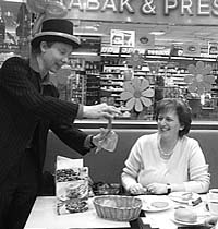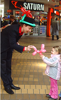 Als Walking-Act fasziniert Zauberer Mickey mit Ballonmodellage, verblüffenden Tricks und Wortwitz. Dabei steht die charmant-lustige Kommunikation mit dem Kunden immer im Vordergrund. Auf Wunsch tritt er auch als Hütchenspieler auf- ein allseits beliebter Spaß, bei dem die Kunden nebst guten Erinnerungen auch Preise, Werbegeschenke oder Gutscheine mit nach Hause nehmen können.
